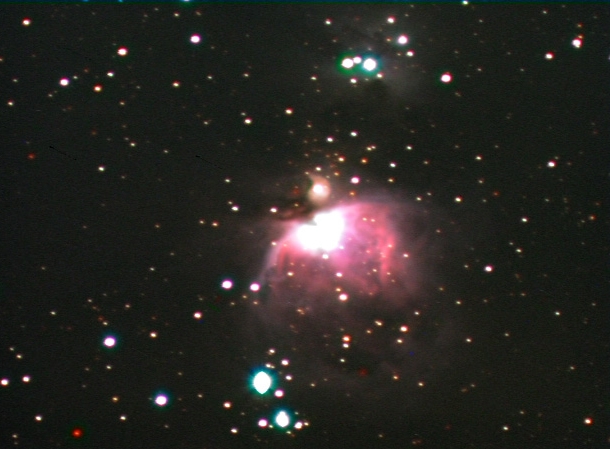 The Great Orion Nebula, M42 & M43. 20x20sec L and 10x20sec RGB fits exposures captured and combined in Meade's Autostar Envisage V5.85 software. Color combine done in PhotoShop. First attempt at using the RGB filter set for the Meade DSI Pro. Telescope: - Camera: Meade DSI Pro monochrome 16bit camera with Peltier cooler mod. 135mm SLR lens stopped down to 4 for wide field of view. Filtration used: Baader UV/IR Cut filter & Meade RGB filters. · Date/Time 2008:02:17 11:30:53 · Resolution 610 x 449