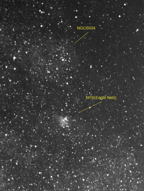 Wide angle image of M16, the Eagle Nebula and NGC6604, an open cluster with nebulosity. 17x15 second FIT. I was trying to get my bearing in this region of the Milky Way so I decided to take some images of M16 with some of my SLR lenses. This is a definite telescope object! Histogram and curves done in PhotoShop. Telescope: - Camera: Meade DSI Pro. 55mm 1:1.8 camera lens stopped down to 2.8 attached for wide field of view. Atop Orion EQ1 motorized mount. Filtration used: Baader UV/IR Cut filter
