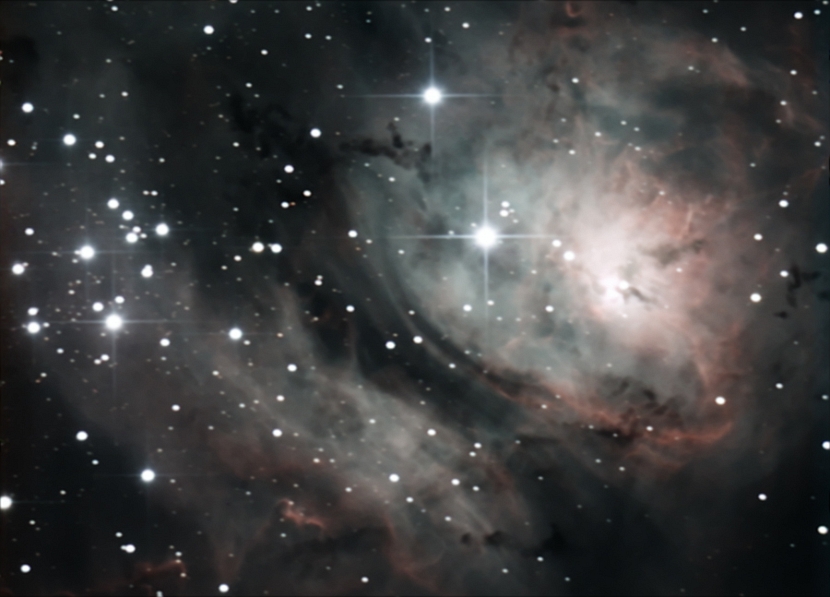 M8, the Lagoon Nebula is a giant interstellar cloud in the constellation Sagittarius. This image is of the core region of the nebula. This H II emission nebula is 4100ly from Earth. 13x300sec fits exposures captured and combined in Nebulosity v2.4.0 software. Finishing touches done in PhotoShop. Telescope: Orion 8" 1000mm f4.9 Newtonian reflector. Mount: Orion Atlas EQ-G Guide Scope: Meade 800mm f10 reduced to f5 with Atik x.5 focal length reducer (ADM rings). Imaging Camera: Mead DSI Color 16bit camera with Peltier cooler modification. Guide Camera: Meade DSI Pro monochrome 16bit camera. Imaging camera in prime focus. Filtration used: Baader UV/IR Cut filter · Date/Time 2011:08:01 18:26:40 · Resolution 900 x 647