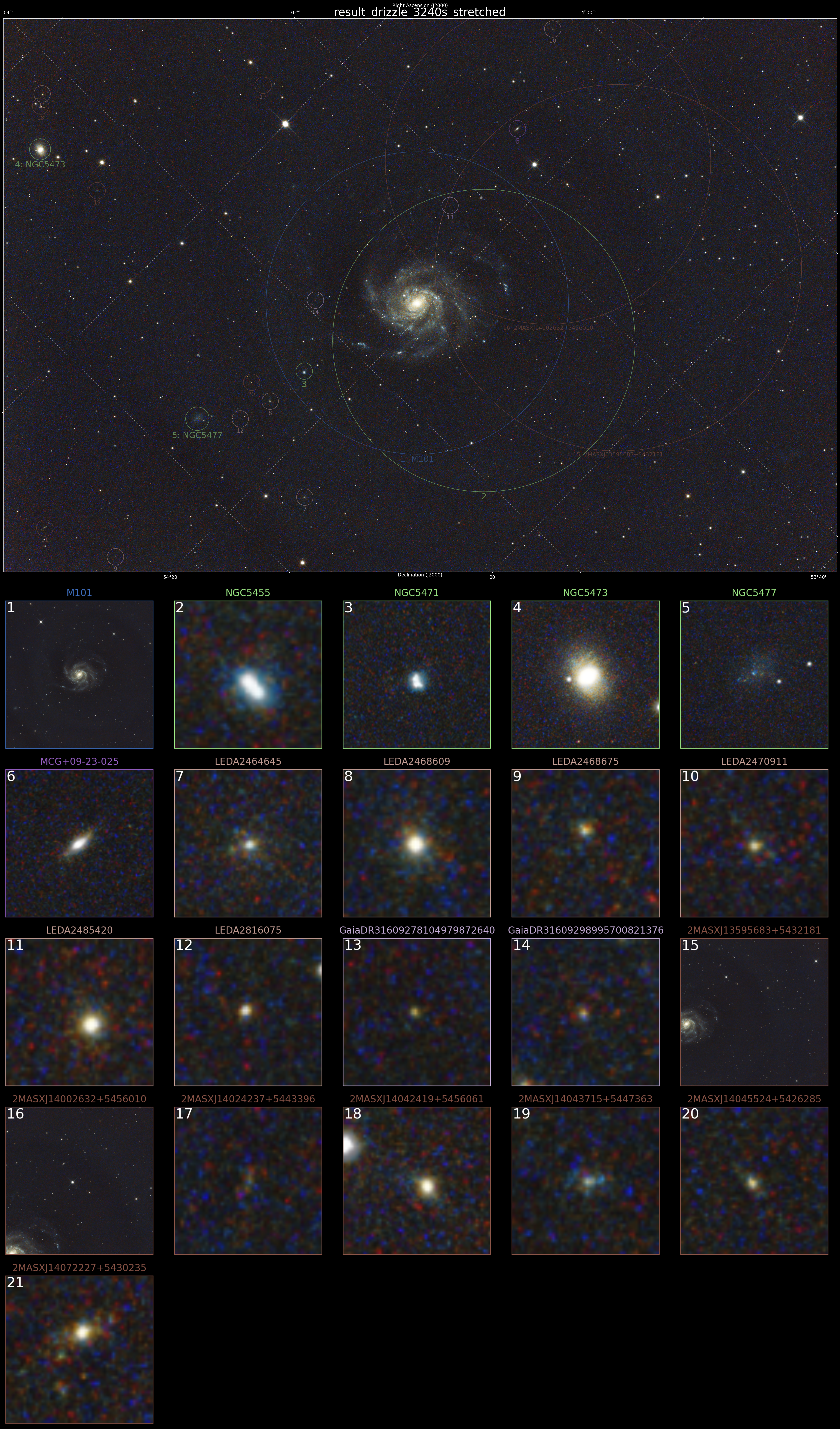 M101, the Pinwheel galaxy in the constellation Ursa Major. M101 is 15Mly from Earth. 27x120sec fits exposures captured N.I.N.A 3.1 and Stacked in Siril 1.4.0 galaxy annotations done in Siril. Telescope: Orion 8" 1000mm f4.9 Newtonian reflector. Mount: Orion Atlas EQ-G Guide Scope: Meade 800mm f10 reduced to f5 with Atik x.5 focal length reducer (ADM rings). Imaging Camera: Canon Rebel T3i full spectrum modification. Guide Camera: Meade DSI Pro monochrome 16bit camera. Imaging camera in prime focus. Filtration used: NA · Date/Time 2012:06:24 15:08:02 · Resolution 4934 x 3274