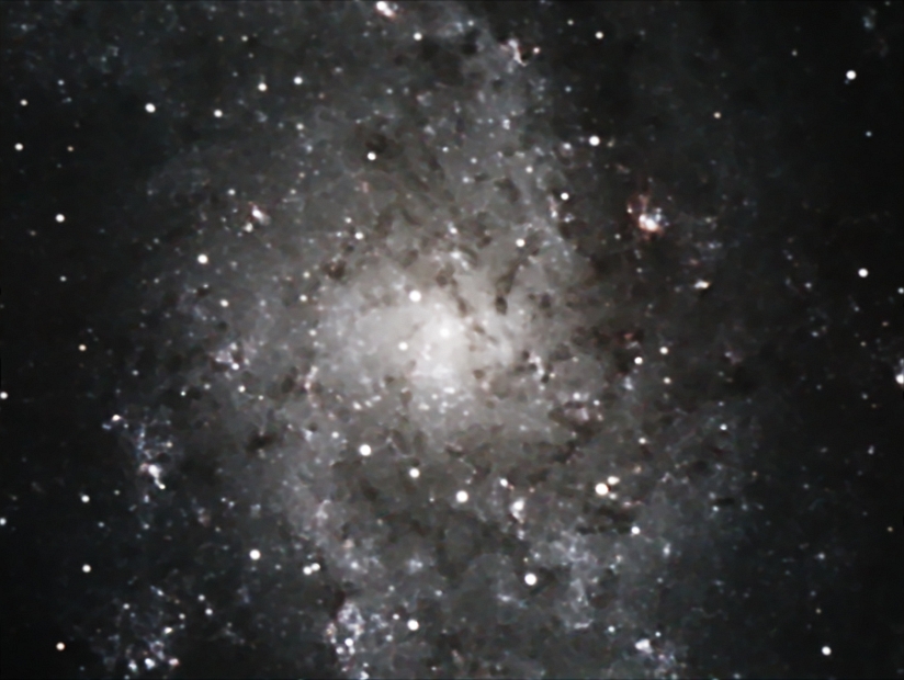 M33, the Triangulum galaxy. The Triangulum Galaxy is a spiral galaxy approximately 3 million light years (ly) from Earth in the constellation Triangulum. It is one of the most distant permanent objects that can be viewed with the naked eye. M33 is the third largest member in the local group after the Andromeda galaxy and the Milky Way. The local group consist of about 30 galaxies. 20x300sec fits exposures. Captured and combined in Nebulosity v2.4.0 software. Finishing touches done in PhotoShop. Telescope: Orion 8" 1000mm f4.9 Newtonian reflector. Mount: Orion Atlas EQ-G Guide Scope: Meade 800mm f10 reduced to f5 with Atik x.5 focal length reducer (ADM rings). Imaging Camera: Mead DSI Color 16bit camera with Peltier cooler modification. Guide Camera: Meade DSI Pro monochrome 16bit camera. Imaging camera in prime focus. Filtration used: Baader UV/IR Cut filter · Date/Time 2012:01:17 20:48:10 · Resolution 900 x 677