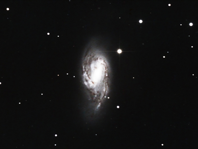 M66, is an intermediate spiral galaxy in the constellation Leo. This galaxy is 36 Mly from Earth. 18x300sec fits exposures captured and combined in Nebulosity v2.4.0 software. Finishing touches done in PhotoShop. Telescope: Orion 8" 1000mm f4.9 Newtonian reflector. Mount: Orion Atlas EQ-G Guide Scope: Meade 800mm f10 reduced to f5 with Atik x.5 focal length reducer (ADM rings). Imaging Camera: Mead DSI Color 16bit camera with Peltier cooler modification. Guide Camera: Meade DSI Pro monochrome 16bit camera. Imaging camera in prime focus. Filtration used: Baader UV/IR Cut filter · Date/Time 2012:04:29 10:13:00 · Resolution 900 x 676