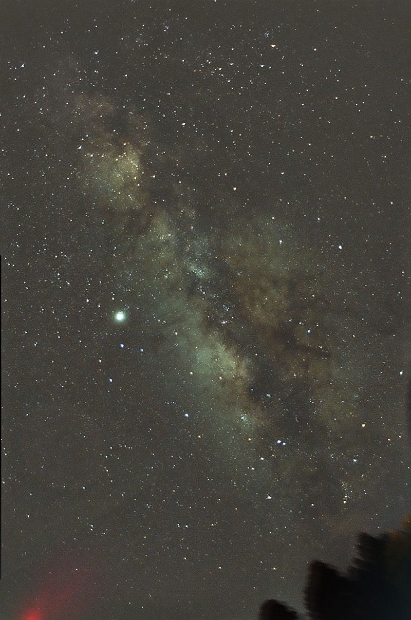 3x5 minute exposure (35mm film) of the galactic center region of the Milky Way. This is my most successful attempt at wide angle astrophotography so far. Stacked in Registax4, dynamic background extraction, curves and histogram done in PixInsight LE 1.0. Finishing touches done in Photoshop. Telescope: - Camera: Fujica ST701. Used FujiColor Superia 800 ISO 35mm film. Lens used was 28mm 1:2.5 wide angle. Atop Orion EQ1 motorized mount.