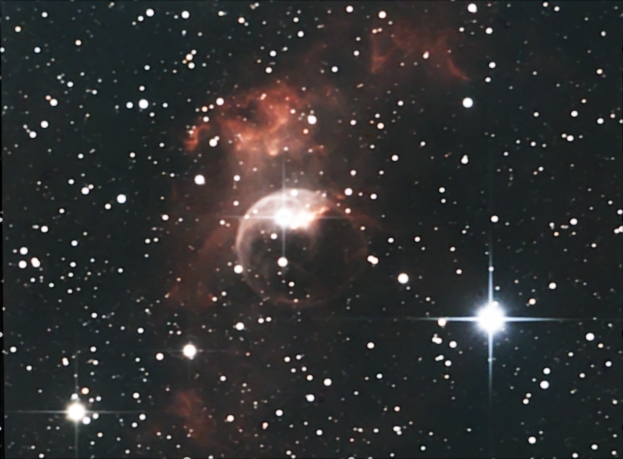 NGC7635, The Bubble Nebula, is a H II region emission nebula in the constellation Cassiopeia. This nebula is between 7,100 and 11,000 light-years from Earth and has an apparent magnitude of about 10. 29x300sec fits exposures captured in the span of two nights. Captured and combined in Nebulosity v2.4.0 software. Finishing touches done in PhotoShop. Telescope: Orion 8" 1000mm f4.9 Newtonian reflector. Mount: Orion Atlas EQ-G Guide Scope: Meade 800mm f10 reduced to f5 with Atik x.5 focal length reducer (ADM rings). Imaging Camera: Mead DSI Color 16bit camera with Peltier cooler modification. Guide Camera: Meade DSI Pro monochrome 16bit camera. Imaging camera in prime focus. Filtration used: Baader UV/IR Cut filter · Date/Time 2011:10:04 22:23:48 · Resolution 623 x 459