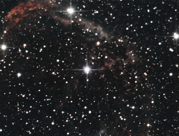 NGC 6888, the Crescent Nebula in the constellation Cygnus. 15x300sec fits exposures captured and combined in Nebulosity v2.4.0 software. Telescope: Orion 8" 1000mm f4.9 Newtonian reflector. Mount: Orion Atlas EQ-G Guide Scope: Meade 800mm f10 reduced to f5 with Atik x.5 focal length reducer (ADM rings). Imaging Camera: Mead DSI Color 16bit camera with Peltier cooler modification. Guide Camera: Meade DSI Pro monochrome 16bit camera. Imaging camera in prime focus. Filtration used: Baader UV/IR Cut filter
