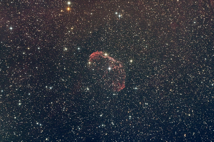 NGC 6888, the Crescent Nebula in the constellation Cygnus. 10x600sec fits exposures captured and combined in Nebulosity v3.0.1 software. Telescope: Orion 8" 1000mm f4.9 Newtonian reflector. Mount: Orion Atlas EQ-G Guide Scope: Meade 800mm f10 reduced to f5 with Atik x.5 focal length reducer (ADM rings). Imaging Camera: Orion StarShoot Pro Color with Baader MPCC Mark III. Guide Camera: Meade DSI Pro monochrome 16bit camera. Imaging camera in prime focus. Filtration used: IR · Date/Time 2013:11:07 14:37:43 · Resolution 900 x 601