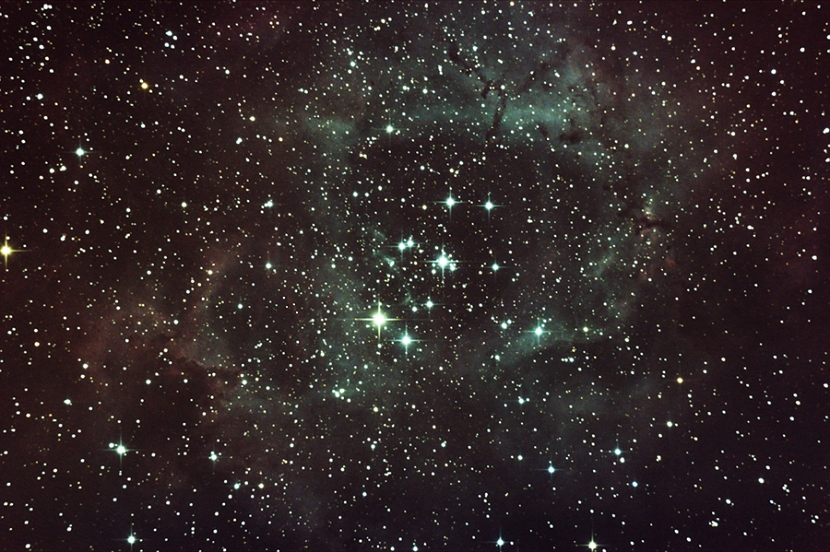 The Rosette Nebula (NGC2244) is a large, circular H II region located near one end of a giant molecular cloud in the Monoceros region of the Milky Way Galaxy. This nebula is 5,200ly from Earth. 5x600sec fits exposures captured and combined in Nebulosity v2.4.0 software. Finishing touches done in PhotoShop. Telescope: Orion 8" 1000mm f4.9 Newtonian reflector. Mount: Orion Atlas EQ-G Guide Scope: Meade 800mm f10 reduced to f5 with Atik x.5 focal length reducer (ADM rings). Imaging Camera: Canon Rebel T3i unmoded. Guide Camera: Meade DSI Pro monochrome 16bit camera. Imaging camera in prime focus. Filtration used: Baader UV/IR Cut filter · Date/Time 2013:03:20 22:37:12 · Resolution 900 x 599